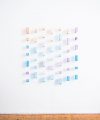 The work B6614 covers a wall space of 150x300cm. Endless identical blue shimmering cubes appear in regular intervals. By contrast Alpenweg (Mountain Trail) is dominated by numerous differently sized and coloured glass blocks with no concrete arrangement. Spanning an area of 130x130cm, these shapes project colours of blue, yellow, pink, red and green. Both structured and unstructured light beams passing through both artworks create colour-intensive reflections on the wall, the floor and in the immediate area. When presenting his installations in exhibition spaces with little natural light, the artist uses several differently positioned sources of artificial light to imitate the natural movement of the sun. The reflections appear like a colourfully woven carpet and change position depending on the way the light falls and the position of the observer. At first glance this work might remind one of Danish-Icelandic artist Olafur Eliasson’s Your solar nebula. This work is a cluster of 328 different sized glass spheres clinging to the wall like water pearls. In contrast to this well-known work which only takes on colourful form through reflection of its surroundings, Bongchull Shin controls the colour intensity of his glass works through wafer-thin coloured layers inserted into the spaces between the glass sheets within the cubes and stripes. So depending on the vantage point the glass blocks appear both coloured as well as transparent and translucent. The overlapping of different coloured shadows and projections causes new colour tones to emerge. The movement of the observer is therefore inherent in Bongchull Shin’s cubes and stripes works. They only come to life when movement occurs.